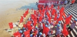 汉口三峡石广场到三阳广场沿线,最适合观看横渡方队在最后一段游程的表现,尤其是可以看到一支支整齐的方队喊着响亮口号,牵着手成功登岸的瞬间。记者詹松 摄