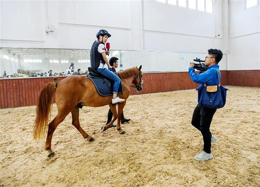 骑马体验时,年轻女骑手沈伊倩吸引了媒体记者注意,得知她是该校马术专业学生及军运会赛会志愿者,大家围在一起采访她。一旁的同学告诉记者,她还是军运会马术场馆宣传片的主角。“暑假我不回去了,主动留校,平时还在努力学习英语,到时候会有很多外国选手参赛,我争取为他们提供最好的服务。”听完这些话,媒体记者们纷纷为她鼓掌。