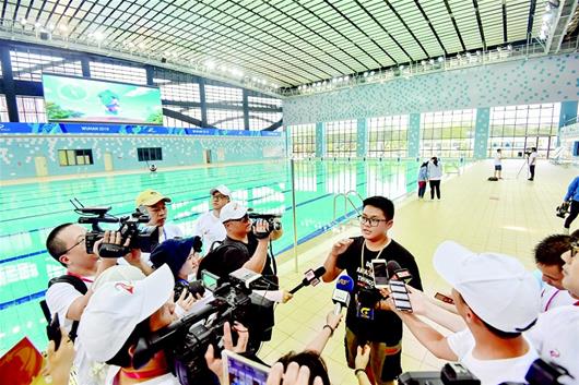 图为:记者们在军运会游泳馆采访
