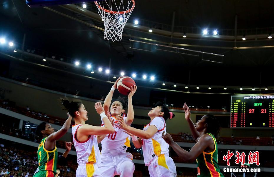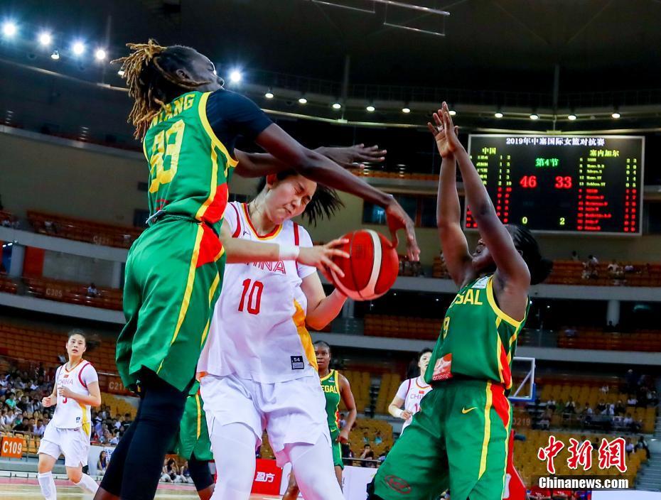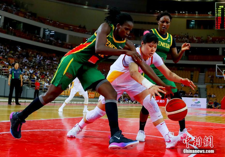 7月19日,中国女篮与塞内加尔女篮第二场热身赛在武汉体育中心体育馆展开。经过四节比拼,中国女篮以66-48击败塞内加尔队,夺得中塞热身赛两连胜。图为中国女篮球员(白衣)与塞内加尔球员篮下拼抢。 中新社记者 张畅 摄