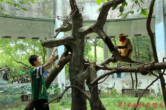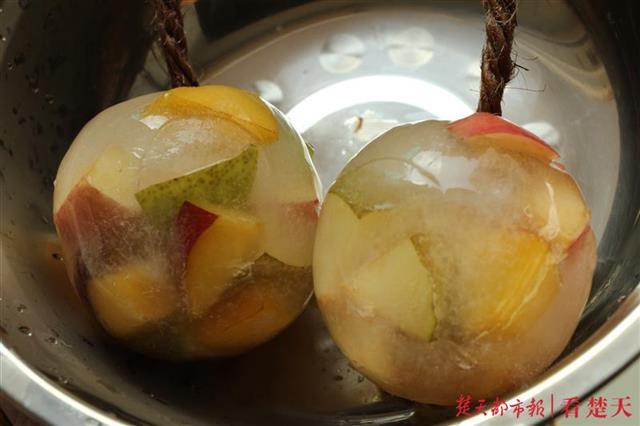 金丝猴的饲养员非常有心,送给它们“魔力冰晶球”——将苹果、桃子等水果切成块,冰冻成一个冰球,猴子们可欢喜了,有玩又能吃,还是冰冰的,清爽又解暑。