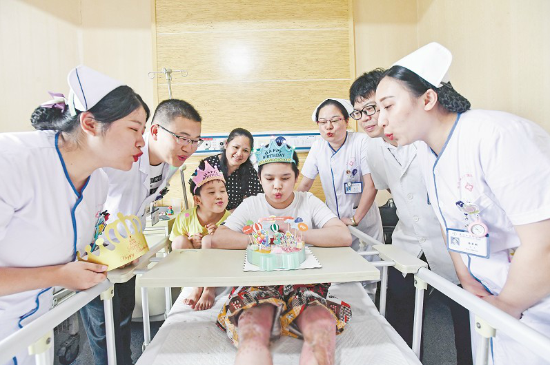 7月29日是小宇13岁的生日,为了鼓励这个坚强男孩,昨日,刘平等医护人员提前准备了生日蛋糕,给他送上一份惊喜。