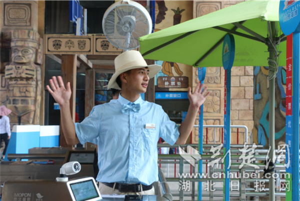 荆楚网客户端—荆楚网消息(记者 童雅琴 通讯员 谭畅)7月25日,武汉室外温度达到了37℃。进入了旅游旺季,周末武汉玛雅海滩游客最高达到2万余人次。面对众多游客,玛雅海滩的工作人员们不畏高温,一如既往坚守在自己的岗位上。
