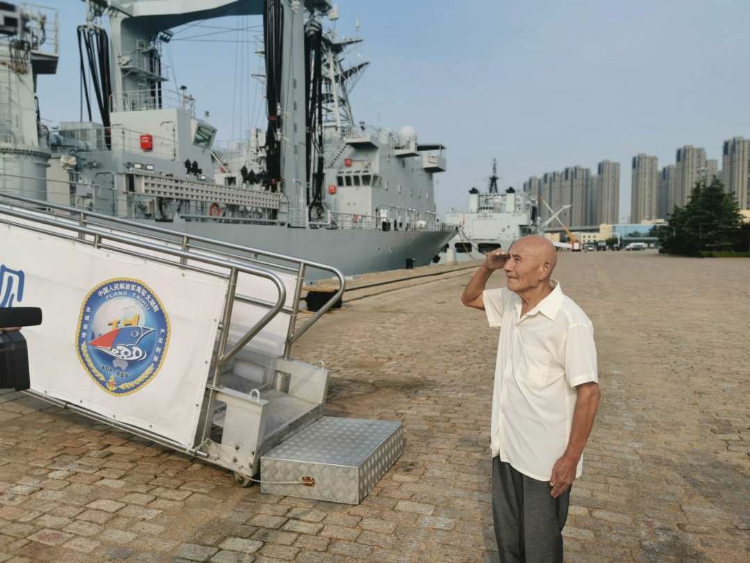 骄阳似火,海浪簇拥的战舰上军旗招展,已经有些驼背的85岁老兵吴禄忠使劲挺直腰杆,向着八一军旗敬礼,足足3分钟。这与3个月前,他在家中收看人民海军成立70周年纪念日阅兵直播时,面向北方敬的军礼一样标准。