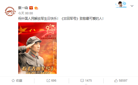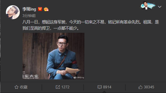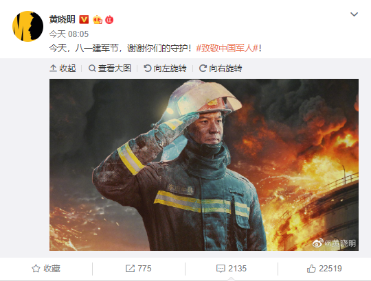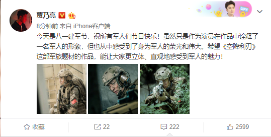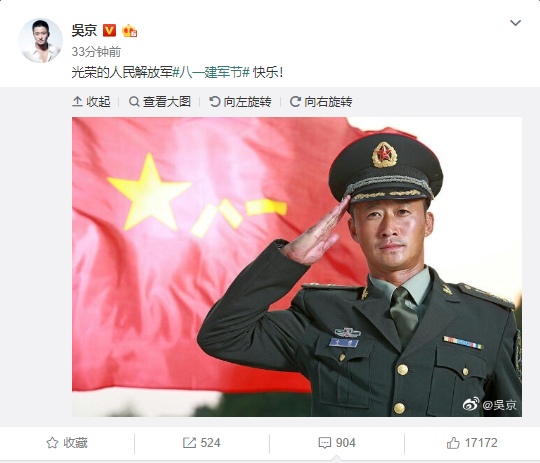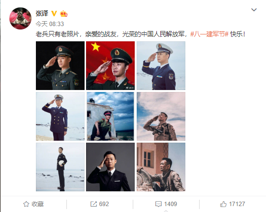8月1日建军节,吴京、黄晓明、贾乃亮、张译、张一山、杜江、李现等一众男星晒出自己在影视作品中穿着各色军装的造型,发文庆八一建军节,祝中国人民解放军生日快乐!祝所有军人们节日快乐!并感恩军人们的守护!