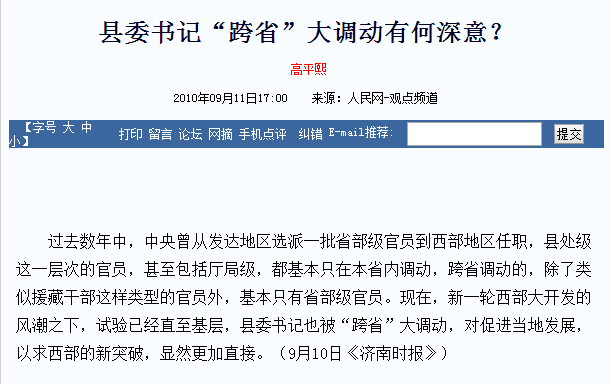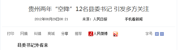 据当时媒体报道,在新一轮西部大开发的背景之下,除省部级官员到西部地区任职外,县委书记也被“跨省”大调动。2010至2011年,贵州分两批从江苏、浙江、山东、河北、重庆5省(市)引进12名优秀干部担任县委书记。