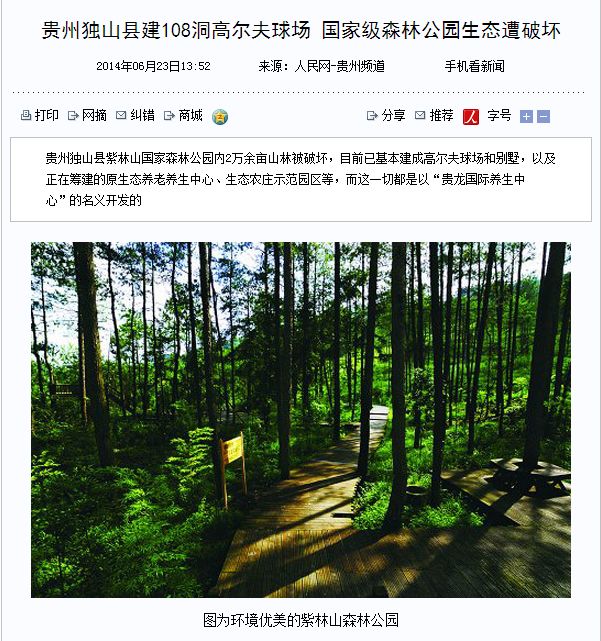 在2014年6月,人民网曾发文《贵州独山县建108洞高尔夫球场国家级森林公园生态遭破坏》,文中称,贵州独山县紫林山国家森林公园内2万余亩山林被破坏,目前已基本建成高尔夫球场和别墅,以及正在筹建的原生态养老养生中心、生态农庄示范园区等。