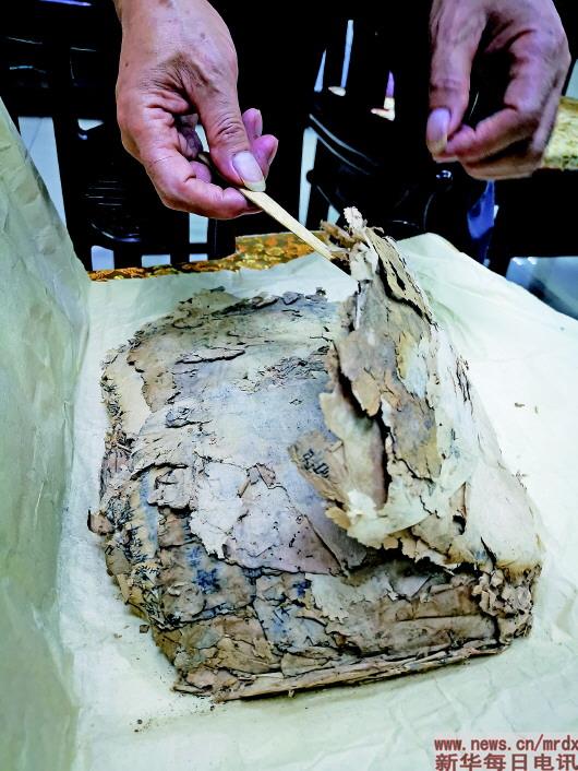 彭德泉小心翼翼地托出一份黄色宣纸包裹的古籍,这实在不能用书来形容,看上去已经和一团揉过的面团差不多,纸张极其脆,只能用竹刀轻轻揭起。彭德泉说,这是刚刚送来的,实在让人痛心。