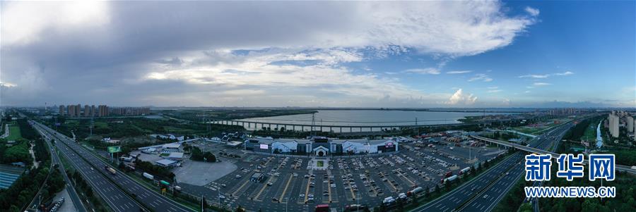 8月8日无人机航拍的沪宁高速公路阳澄湖服务区全景。新华社记者 季春鹏 摄
