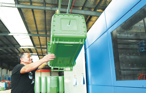 8月13日,在孝南经济开发区的湖北省益乐塑业有限公司车间里,工人忙着生产垃圾桶。从今年初开始,订单纷至沓来,该公司开足马力生产分类垃圾桶。 ( 记者 李文勇 通讯员 夏至益 摄)