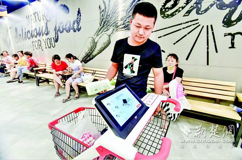 昨日,记者在中百仓储常青店走访时发现,该超市引进20台自助购物车。顾客可以边逛边买,通过感应口扫描要购买的商品,即可进行网上支付,在购物车上直接结账,免去了排队的麻烦。