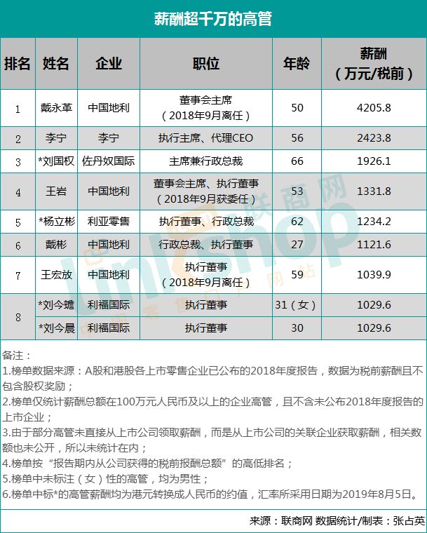 2、报告期内,年薪过千万的高管共有9位。与2017年度相比,有四位新增,分别是中国地利董事会主席兼执行董事王岩(1331.8万元)、中国地利的行政总裁戴彬(1121.6万元)以及利福国际的执行董事刘今蟾(1029.6万元)和刘今晨(1029.6万元)姐弟;有两位退出,分别为高鑫零售首席执行官黄明端(328.2万元)以及利福国际前主席刘銮鸿(退休);年薪超2000万的仅戴永革与李宁。