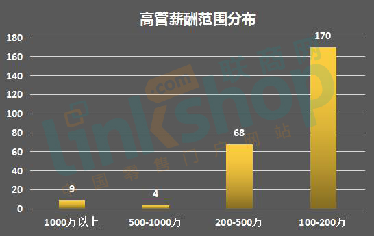 5、报告期内,年薪在100万(含)至200万以内(不含)的高管达170位。这一梯队也是上市零售企业高管们的主要薪酬范围。