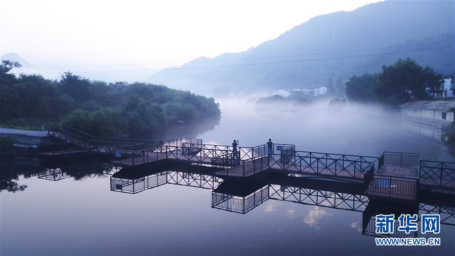 8月15日,游人在桃花潭风景区游览拍照(无人机拍摄)。 当日清晨,位于安徽省宣城市泾县的桃花潭风景区晨雾缭绕,美如画卷。 新华社记者 张端 摄