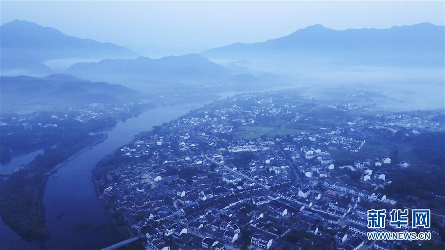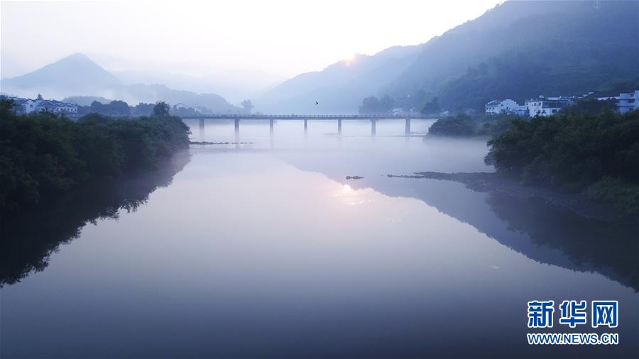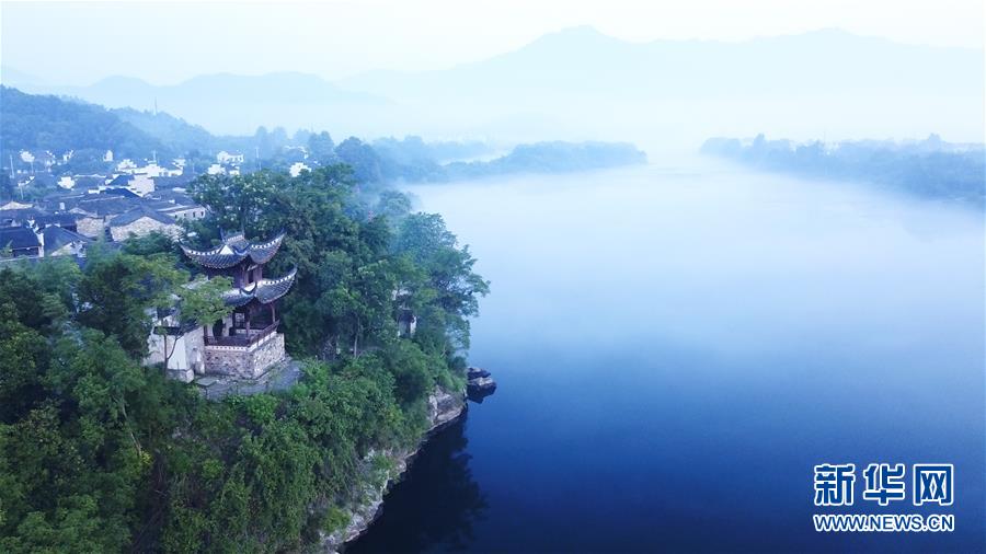 8月15日无人机拍摄的桃花潭风景区。 当日清晨,位于安徽省宣城市泾县的桃花潭风景区晨雾缭绕,美如画卷。 新华社记者 张端 摄