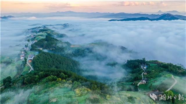 8月13日晨,在竹溪县县河镇马鹿山航拍的无际云海仙境。十堰市竹溪县县河镇马鹿山层峦叠嶂的山脉、田园和民居在漫布的云海间若隐若现,宛如人间仙境,美不胜收。(视界网温大树摄)