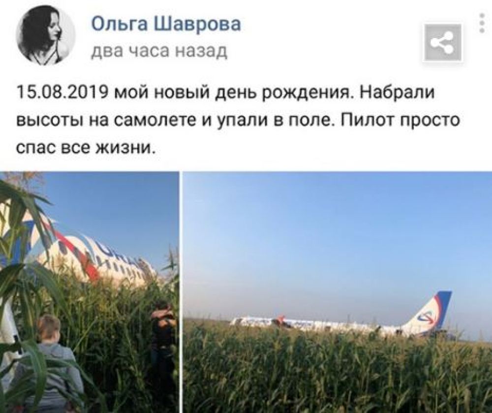 乘客奥莉佳·沙夫罗娃在社交网站上发帖说:“2019年8月15日是我新的生日。坐着飞机升空又掉进了玉米地。飞行员救了所有人的命。”