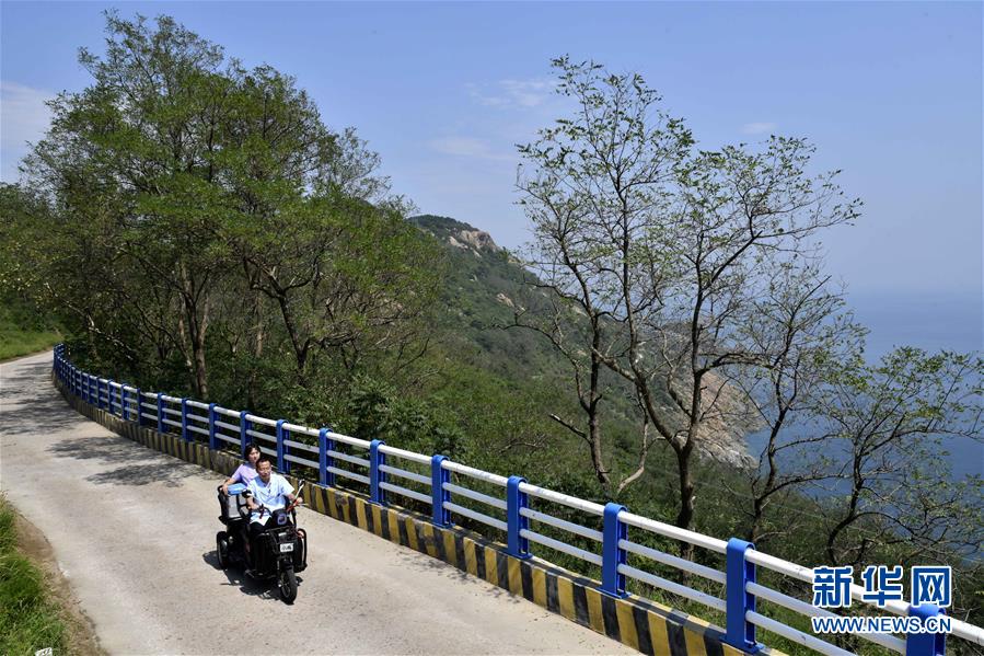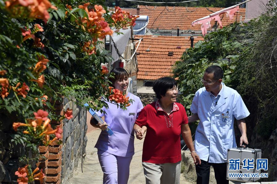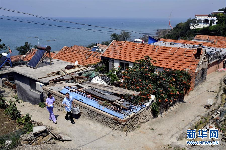 8月16日,在青岛市西海岸新区灵山岛,周兆敬(前)在入户巡诊途中。 新华社记者 王凯 摄