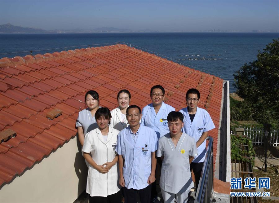 8月17日,在青岛市西海岸新区灵山岛社区卫生服务中心,周兆敬(前中)和同事合影留念。 新华社记者 郭绪雷 摄