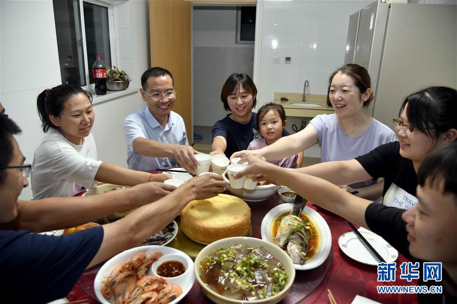 8月16日,在青岛市西海岸新区灵山岛社区卫生服务中心,周兆敬(左三)和同事们做了饭菜,举杯庆祝即将到来的中国医师节。 新华社记者 郭绪雷 摄