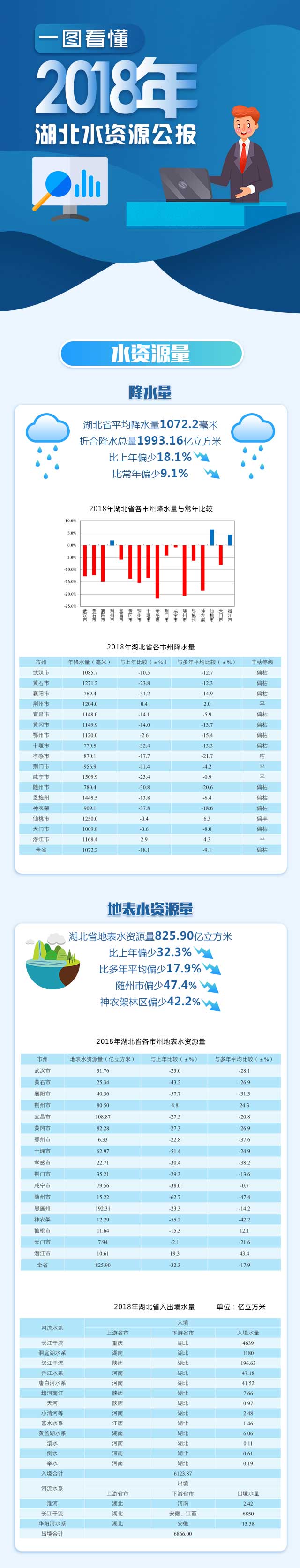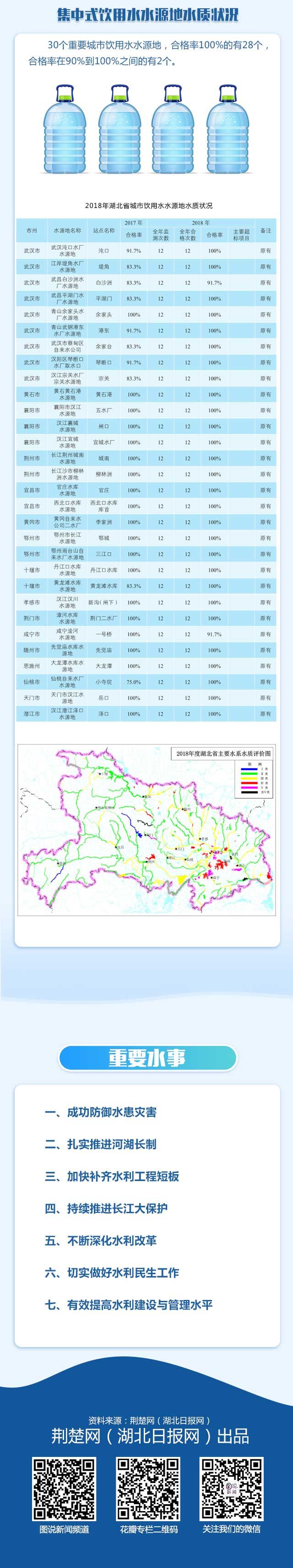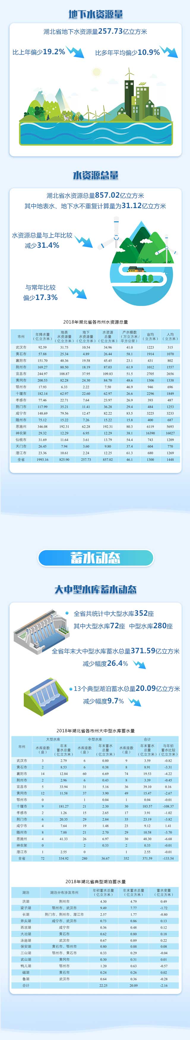 荆楚网客户端—荆楚网消息(记者李川 )近日,湖北省水利厅正式发布了《2018年湖北省水资源公报》(以下简称《公报》)。《公报》显示,2018年全省平均降水量1072.2毫米,比常年偏少9.1%,属偏枯年份。地表水资源量825.90亿立方米,地下水资源量257.73亿立方米,地表水资源与地下水资源不重复计算,全省水资源总量857.02亿立方米。