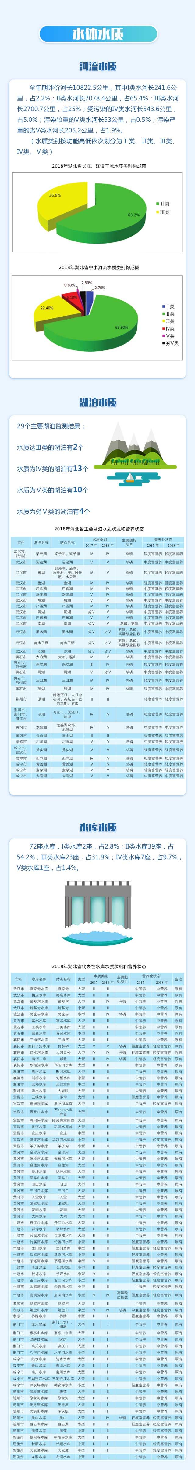 去年对长江、汉江、淮河干流湖北段及省内92条中小河流的水质进行了监测评价。河长10822.5公里,Ⅲ类水及Ⅲ类水以上的河长占总评价河长的92.6%,比上年 提高4.4%。劣于Ⅲ类水的河长占总评价河长的7.4%,主要分布在四湖总干渠、涢水、澴水、浠水、通顺河、神定河、泗河、小清河、白河、唐河、蛮河、浰河、竹皮河、汉北河、沦河等部分河段,主要超标项目为氨氮、总磷、五日生化需氧量。