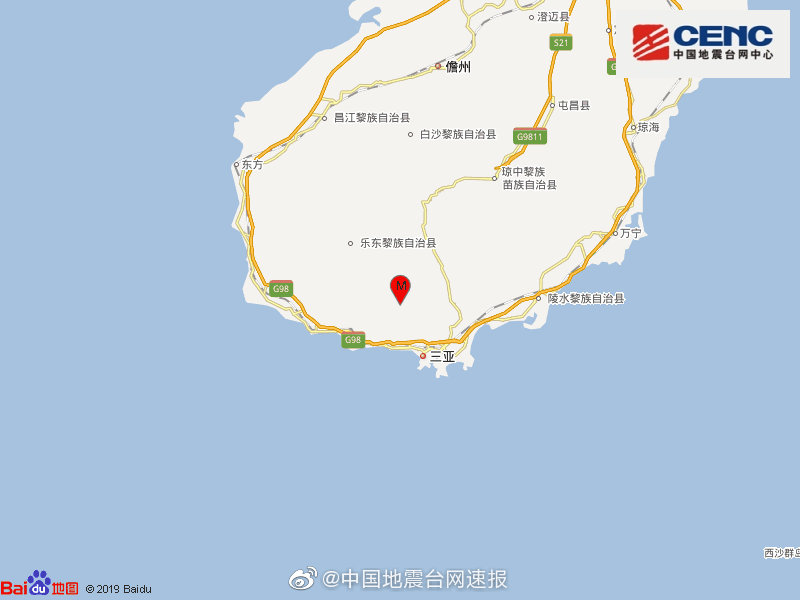 中国地震台网正式测定:8月20日19时17分在海南三亚市天涯区(北纬18.51度,东经109.41度)发生4.2级地震,震源深度12千米。震中距三亚市31公里,距儋州市114公里,距海口市195公里。
