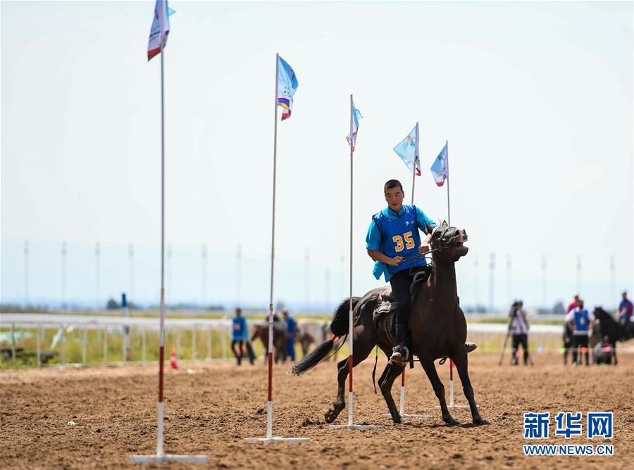 8月20日,骑手在“蒙古马”传统技巧表演中展示骑马穿桩。 当日,“蒙古马”传统技巧表演在呼和浩特市内蒙古少数民族群众文化体育运动中心举行,此次表演共包括骑马穿桩、射箭、骑马拾哈达、骑马绕桶等多个传统马术技巧项目。 新华社记者 彭源 摄