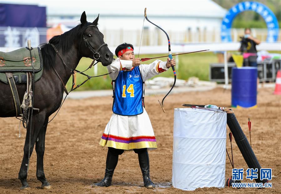 8月20日,骑手在“蒙古马”传统技巧表演中展示射箭。 当日,“蒙古马”传统技巧表演在呼和浩特市内蒙古少数民族群众文化体育运动中心举行,此次表演共包括骑马穿桩、射箭、骑马拾哈达、骑马绕桶等多个传统马术技巧项目。 新华社记者 彭源 摄