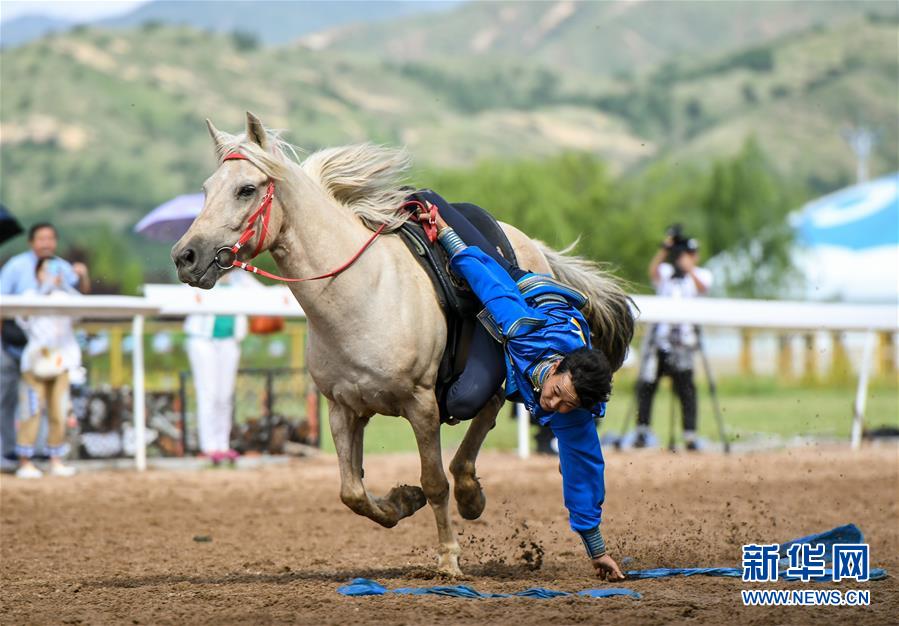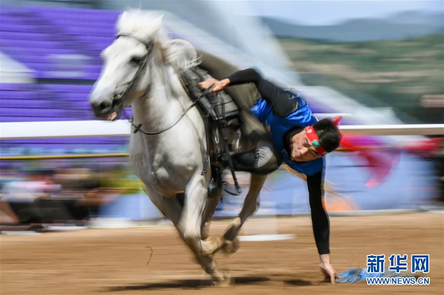 8月20日,骑手在“蒙古马”传统技巧表演中展示骑马拾哈达。 当日,“蒙古马”传统技巧表演在呼和浩特市内蒙古少数民族群众文化体育运动中心举行,此次表演共包括骑马穿桩、射箭、骑马拾哈达、骑马绕桶等多个传统马术技巧项目。 新华社记者 彭源 摄