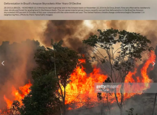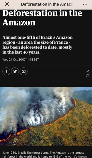在这篇报道中,对这张图片的说明是:“1989年6月,巴西:森林燃烧。亚马孙是世界上最大的雨林,拥有世界上已知陆地植物物种的15%,以及世界上近10%的哺乳动物。在一公顷的土地上有300多种树木。图片来源:Sipa Press/Rex Features”