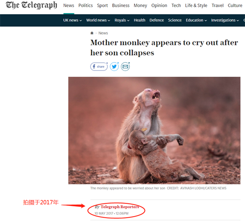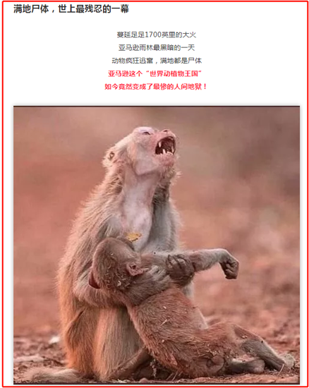 网上流传的亚马孙雨林火灾图片中,其中有两张与动物有关的图片十分令人动容。其中,一张猴子妈妈抱着失去意识的小猴子“大哭”的照片,让人揪心。事实上,这也不是来源于此次火灾。这是印度摄影师阿维纳什·洛迪2017年在印度中部城市贾巴尔普尔拍摄的一张照片。他当时曾就这组照片接受英国“每日电讯报”的采访,他表示小猴子昏过去了,猴妈妈似乎担心地在大哭。