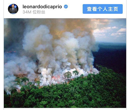 还有一张从空中俯拍的森林火灾图也流传很广,茂密的森林过火区域冒出的白烟直冲云霄。这张图片在社交媒体上被大量转载,著名演员莱昂纳多·迪卡普里奥也转发了这张图。但据查证,这张图片去年就已经出现在网上,不是这次亚马孙雨林火灾中拍摄的。