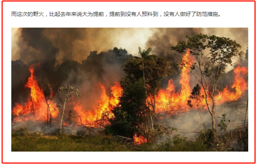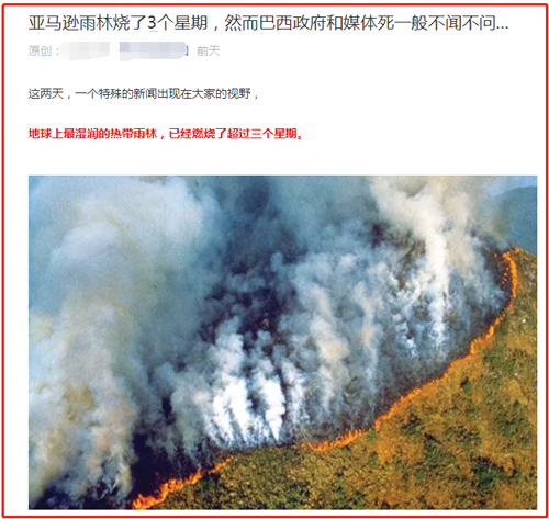 被称为“地球之肺”的亚马孙雨林已连续烧了3个星期,亚马孙雨林火灾话题也连续多日登上微博热搜,一些微信公众号推送的相关文章,阅读数甚至已经接近百万。这场火灾在世界各地引起广泛关注,国外的社交媒体网友还发起了“为亚马孙祈福”的活动。然而最近被广泛传播的火灾图片中,有不少图片并非来自于此次亚马孙雨林火灾。