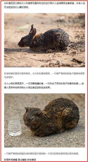 除了上面这张猴子图片,一张兔子被烧焦的图片也在网上被热传。据查证,这张图片其实是拍摄于去年美国加利福尼亚的一场大火。国内媒体对这场大火也进行过报道,如封面新闻去年11月13日曾刊发过此图。当时,美国加州北部的这场野火已经成为该州历史上最致命的火灾,人们纷纷逃离。