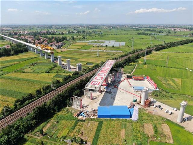 据介绍,转体梁与既有铁路线斜交角度为71度,项目部采取了平衡转体的施工方法,减少上部结构施工对铁路行车安全的影响。转体时,用于旋转梁的球胶运行非常平稳,向位误差不超过1毫米,确保梁精准地转到指定位置。