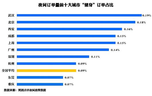 值得一提的是,武汉白领夜间消费最爱健身,武汉的健身订单占全市总订单的0.19%,高居全国第一,其次为北京0.18%与西安0.16%。这一爱好显得健康又时尚。
