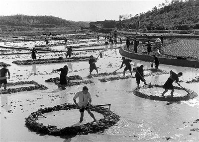 1959年冬,湖南长沙县金井人民公社认真贯彻农业生产的“八字宪法”,抓紧冬修水利、积肥和深翻土地,为来年丰收打好基础。这是公社社员正在田间沤肥。新华社记者 王平 摄