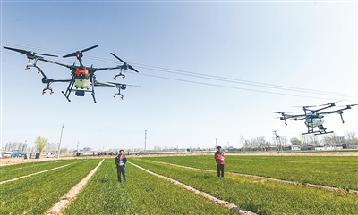 随着一系列乡村振兴战略举措的扎实推进,中国经济社会发展的根基不断夯实。这是2019年4月1日,在河北省故城县郑口镇果子口村化肥农药减量增效示范基地,工作人员操作无人机给小麦施肥。新华社记者 李晓果 摄