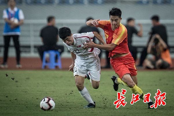 - 9月5日晚,在中国国奥队与朝鲜队的热身赛中,凭借着林良铭第94分钟的进球,国奥队1:1逼平对手。图为中国国奥队球员与朝鲜国奥队队员拼抢。 长江日报记者 任勇 摄