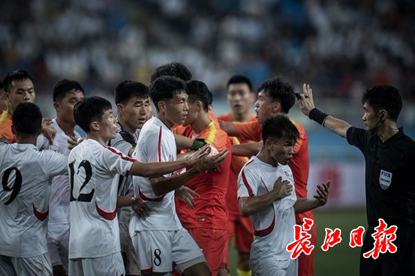 - 图为朝鲜国奥队队员与主裁发生冲突。 记者 任勇 摄