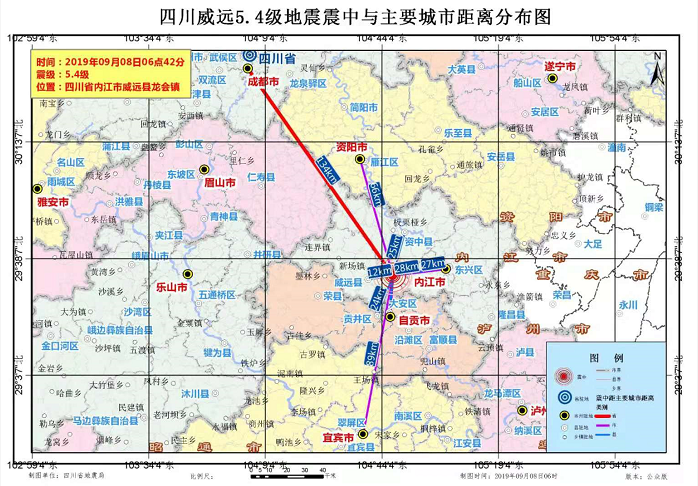 四川威远5.4级地震震中与主要城市距离分布图 ↓