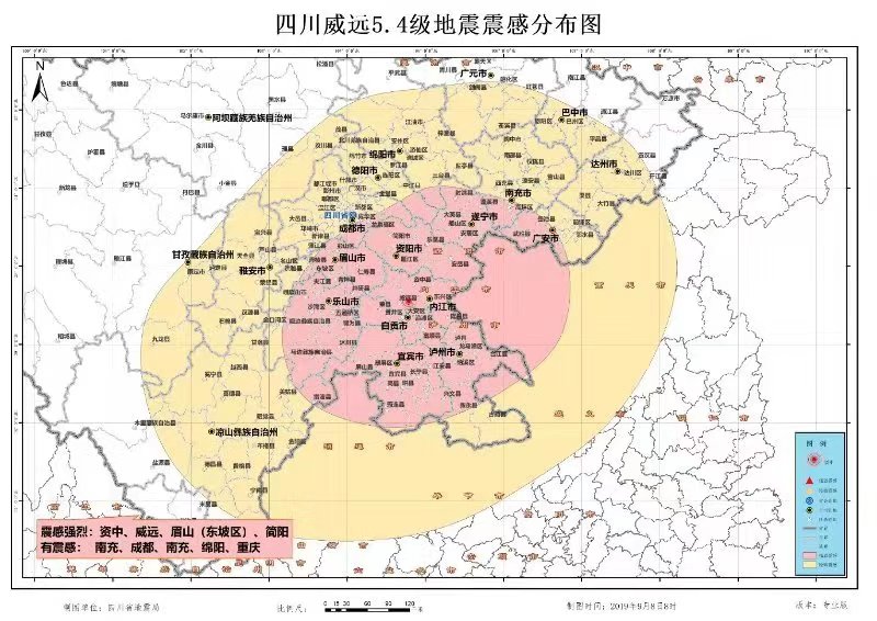四川省地震局发布了内江威远5.4级地震震感分布图,其中资中、威远、眉山(东坡区)、简阳等地震感强烈,南充、成都、绵阳、重庆等地有震感。(央视记者 杨妮)