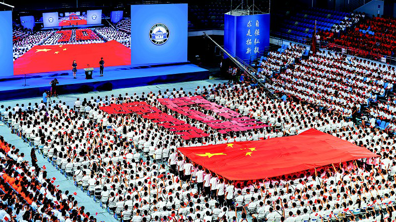 开学典礼现场,全场师生挥舞手中的国旗,深情合唱《我和我的祖国》《歌唱祖国》。新生们庄重地传递巨幅国旗,献礼新中国70华诞。学生方阵变换着从10到70的数字,向新中国成立70年来的光辉历程致敬。他们齐声喊出“祝伟大的祖国繁荣昌盛”,用青春告白祖国。