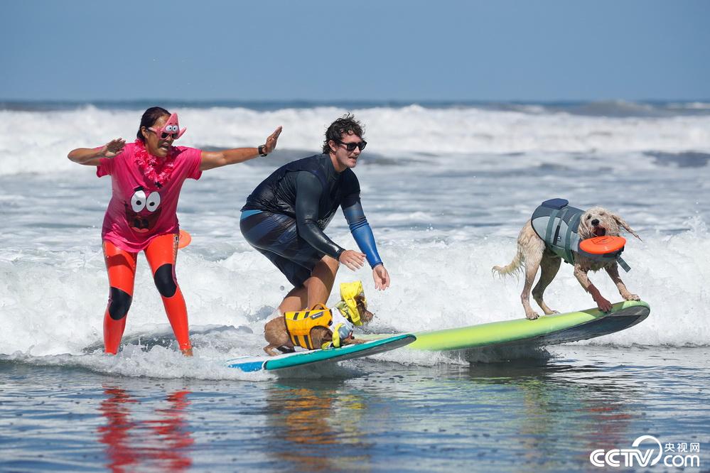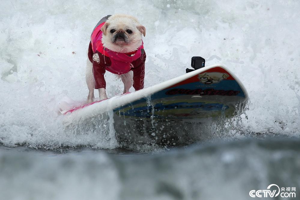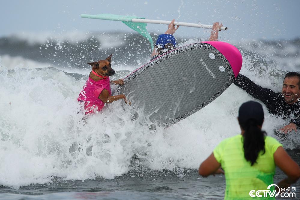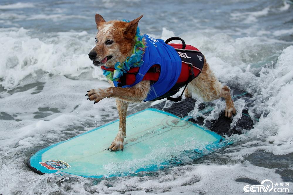 - 当地时间2019年9月8日,美国加州德尔马,当地举办第14届狗狗冲浪赛,70多只萌犬参加了5个不同重量级别的冲浪比赛。 视觉中国