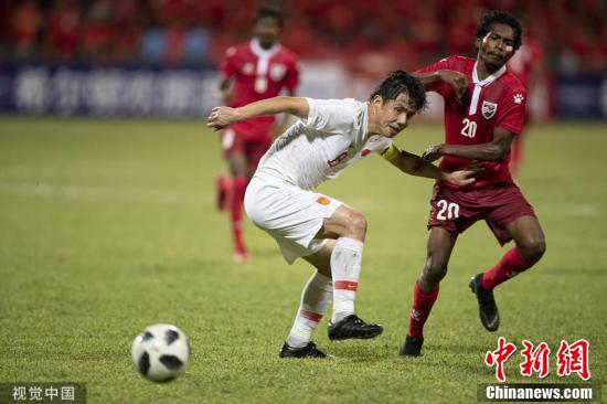 - 北京时间9月10日晚,2022年世界杯亚洲区预选赛40强赛,中国队客战5球大胜马尔代夫队。上半时李磊助攻吴曦首开记录,随后武磊扩大比分,下半场杨旭点射破门,归化球员艾克森梅开二度,最终国足以5:0的比分取得开门红。图为蒿俊闵在比赛中。图片来源:视觉中国