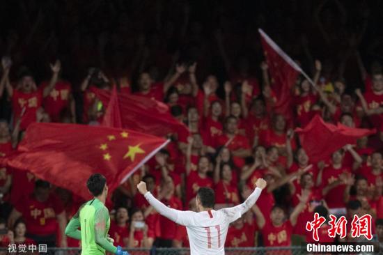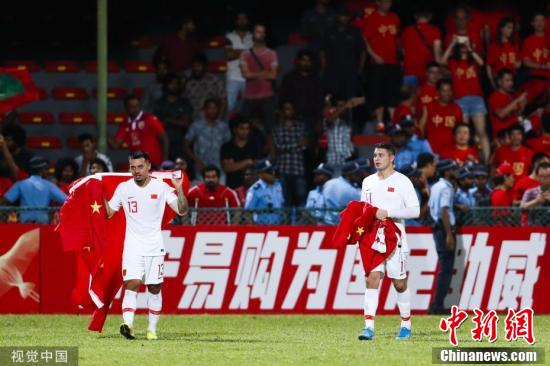 - 北京时间9月10日晚,2022年世界杯亚洲区预选赛40强赛,中国队客战5球大胜马尔代夫队。上半时李磊助攻吴曦首开记录,随后武磊扩大比分,下半场杨旭点射破门,归化球员艾克森梅开二度,最终国足以5:0的比分取得开门红。图为艾克森进球后在中国队球迷区庆祝。图片来源:视觉中国