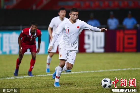 - 北京时间9月10日晚,2022年世界杯亚洲区预选赛40强赛,中国队客战5球大胜马尔代夫队。上半时李磊助攻吴曦首开记录,随后武磊扩大比分,下半场杨旭点射破门,归化球员艾克森梅开二度,最终国足以5:0的比分取得开门红。图为艾克森主罚点球。图片来源:视觉中国
