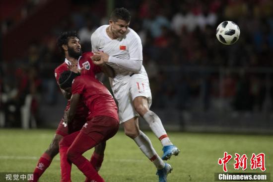- 北京时间9月10日晚,2022年世界杯亚洲区预选赛40强赛,中国队客战5球大胜马尔代夫队。上半时李磊助攻吴曦首开记录,随后武磊扩大比分,下半场杨旭点射破门,归化球员艾克森梅开二度,最终国足以5:0的比分取得开门红。图为艾克森在比赛中争抢头球。图片来源:视觉中国