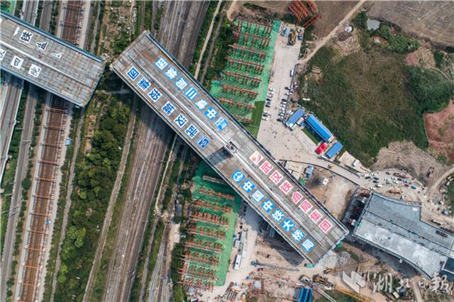 - 9月11日14时30分,经过90分钟的旋转,世界上跨度最大、桥面最宽的转体桥——杨泗港快速通道青菱段跨铁路斜拉桥成功转体,宣告杨泗港快速通道主线全部拉通。 图为:号墩、号墩“握手”,杨泗港快速通道青菱段跨铁路斜拉桥成功转体。